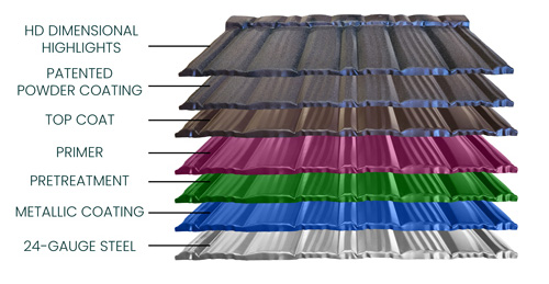 MMR offers a patented powder coating process that provides maximum protection for the metal surface, which already has a premium Kynar paint finish applied. The powder coating process is unlike stone coated metal roofing, which has ceramic chips applied to the metal with an adhesive. Instead, powder coating involves electrostatically applying a specialized powder to the metal surface, which is cured under heat, forming a hard, protective layer. Simply put, powder coating provides superior protection on metal roofing panels due to its method of application and ability to permanently bond with the metal surfacing. Finally, our HD highlight treatment gives the panels a sense of dimension, for a stunning look!